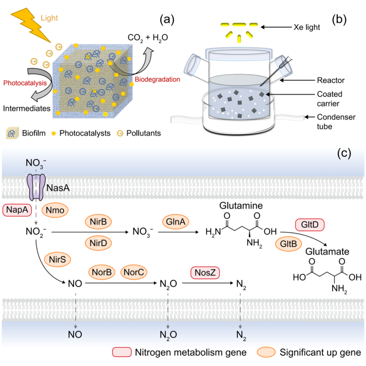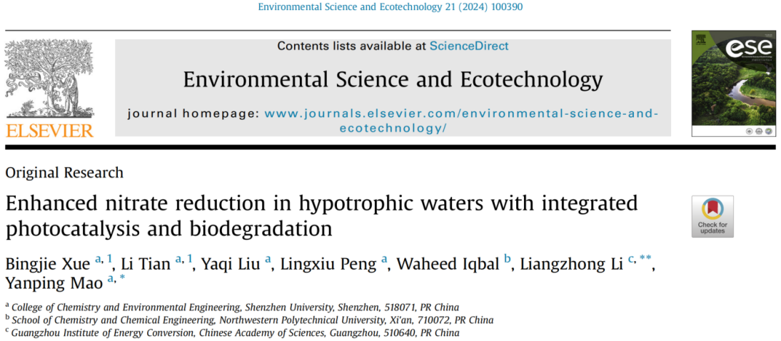Recently, associate professor Yanping Mao’s group from the College of Chemistry and Environmental Engineering, Shenzhen University published the latest research “Enhanced nitrate reduction in hypotrophic waters with integrated photocatalysis and biodegradation” on Environmental Science and Ecotechnology (IF: 12.6, JCR Region 1, TOP Journal). This research not only elucidates the photocatalytic mechanism behind nitrate reduction in hypotrophic conditions but also provides genomic insights that pave the way for alternative approaches in water remediation technologies.