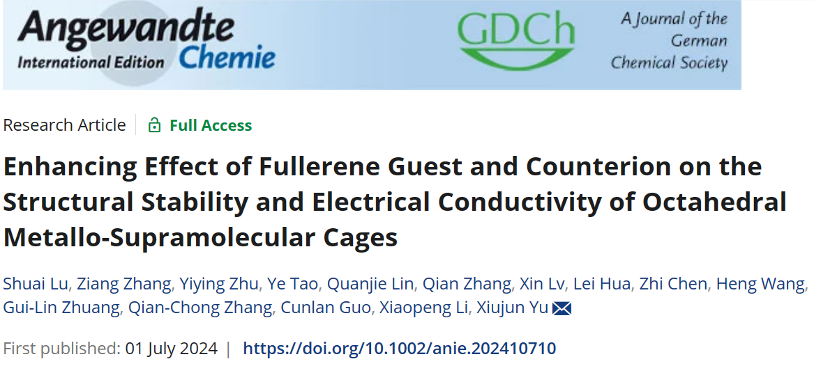 Article details: Shuai Lu, † Ziang Zhang,† Yiying Zhu, Ye Tao, Quanjie Lin, Qian Zhang, Xin Lv, Lei Hua, Zhi Chen, Heng Wang, Gui-Lin Zhuang, Qian-Chong Zhang,* Cunlan Guo,* Xiaopeng Li, Xiujun Yu*. Enhancing Effect of Fullerene Guest and Counterion on the Structural Stability and Electrical Conductivity of Octahedral Metallo-Supramolecular Cages. Angew. Chem. Int. Ed., 2024, e202410710.