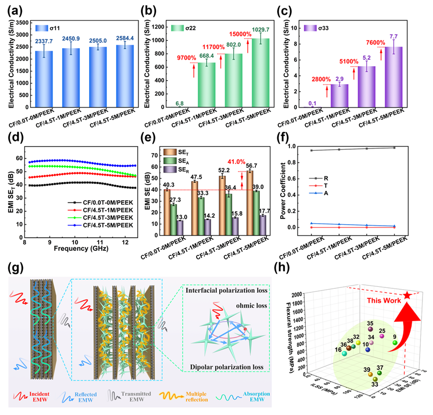 碳纤维增强热塑性聚醚醚酮(CF/PEEK)层合板因其优异的轻质高强、耐腐蚀性、耐高温及可回收性,在航空航天、国防军工、高端装备、人形机器人等战略前沿领域具有广泛的应用前景。然而,CF/PEEK层合板在服役过程中会受到各类冲击载荷作用进而导致层间开裂等损伤,以及新一代装备对高功率电子设备抗电磁干扰(EMI)、导电导热等新的需求,现有碳纤维复合材料的单一性能难以满足极端环境、工况下的综合性能需求。因此,亟需开发兼具结构性与功能特性的CF/PEEK复合材料。星光直播